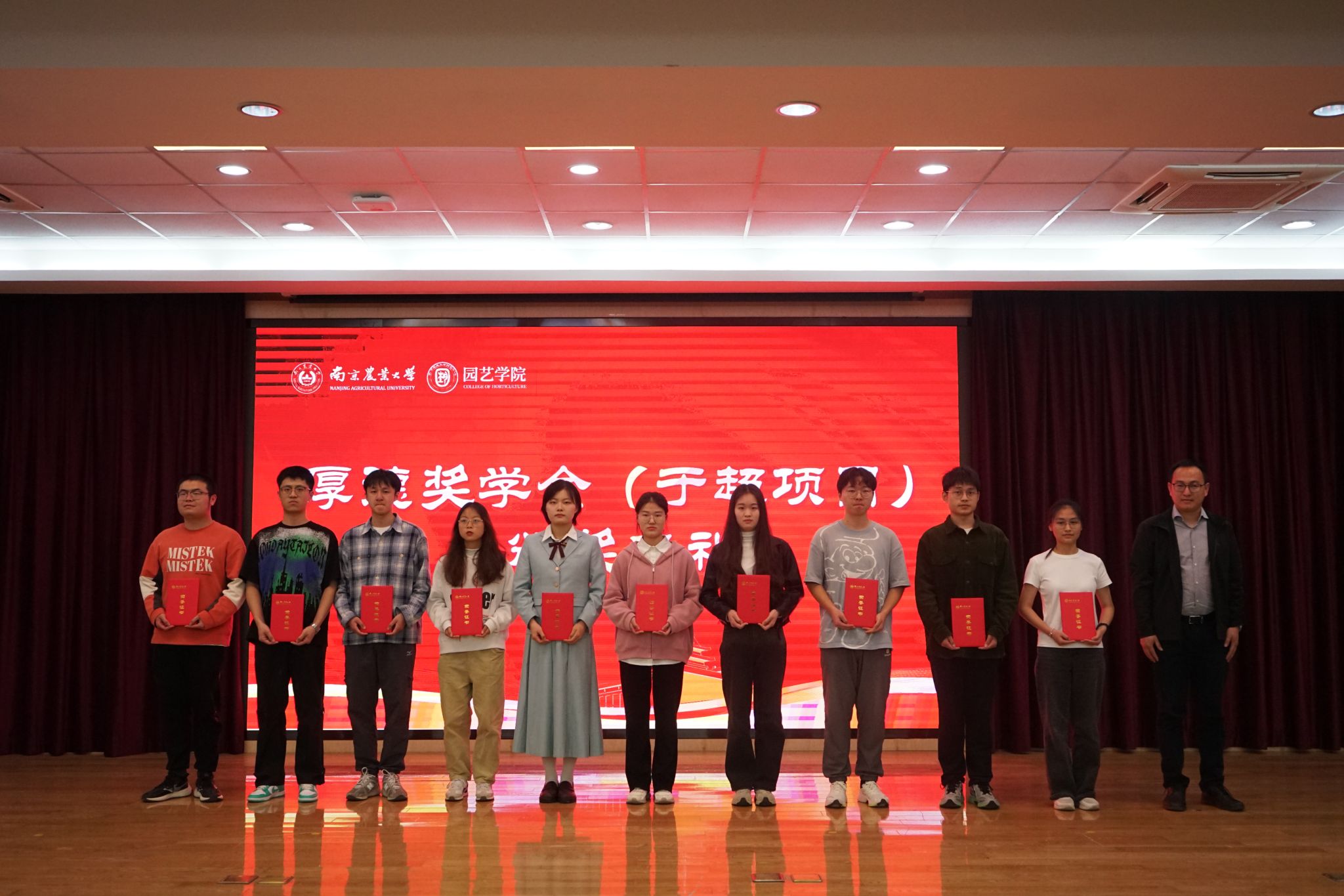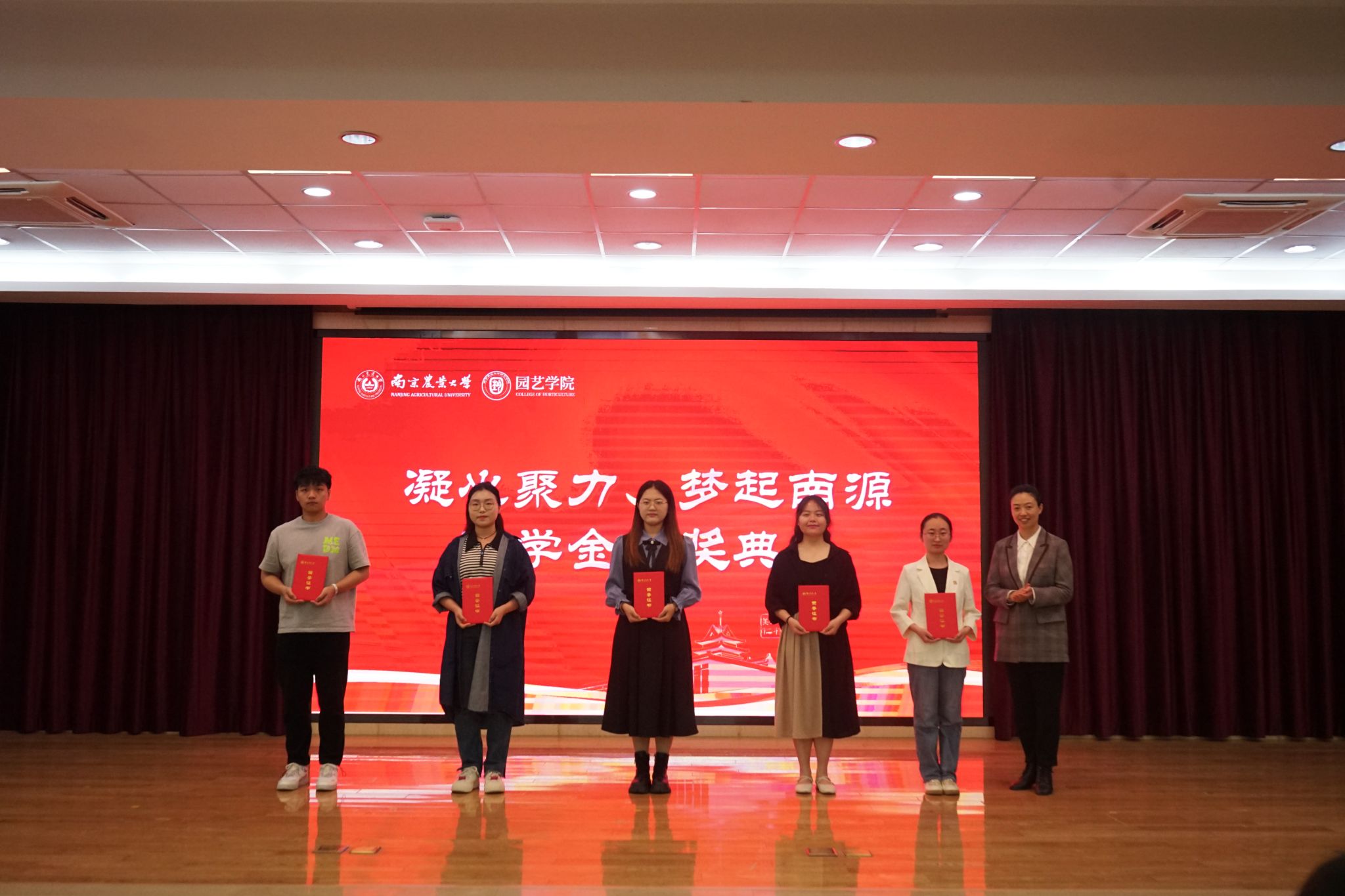 企业及教师代表为获百绿园林奖学金、坂田种苗企业奖学金、章镇奖学金、厚德(于超项目)奖学金、宏旭达园林奖学金、凝心聚力学业奖学金、梦起南源创新创业奖学金的53名学生颁发获奖证书。