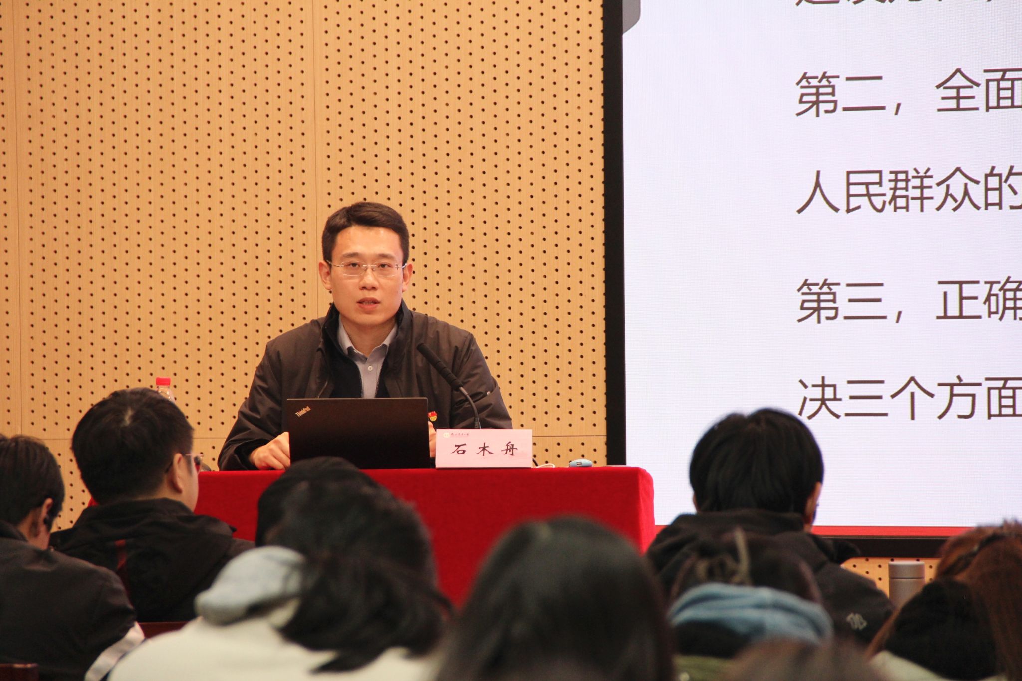 在本次党课的开篇,石木舟以共产党员张人亚的事迹为引子,引入了本次党课的核心主题:“永不褪色的信仰——党章之路”。随后,他详细阐述了党章的基本框架和其在党的建设中的重要地位,带领大家深入探讨了党章的发展历程。石木舟从党的第一次全国代表大会制定的具有党章性质的党纲开始,一直到党的第二十次全国代表大会对党章的不断修订和完善,详尽地介绍了各个历史时期党章的特点及其核心内容。