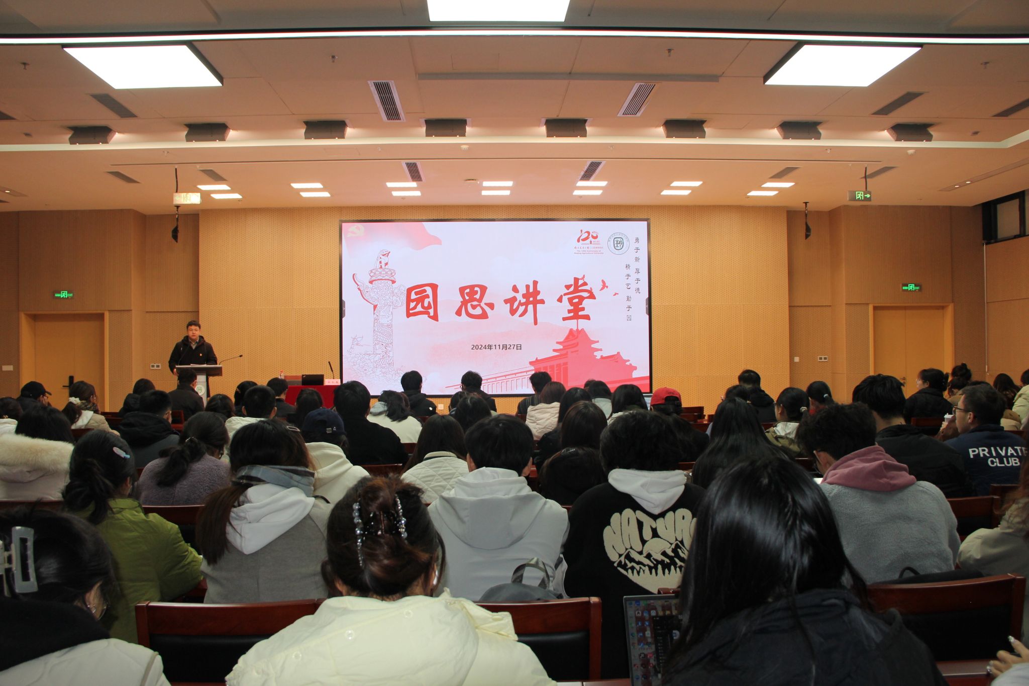 11月27日下午,天天a片 “园思讲堂”系列讲座之“永不褪色的信仰——党章之路”主题党课在滨江校区园艺楼142举办。本次党课天天a片 党委副书记石木舟主讲,天天a片 辅导员赵家豪主持本次活动以滨江校区为主会场,卫岗校区进行同步转播共计约260名入党积极分子和入党启蒙学员参加