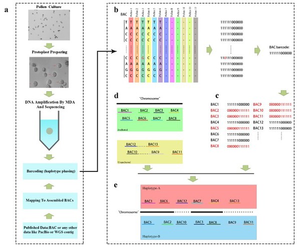 张绍铃教授团队于2012年成功组装了世界第一个梨基因组,本研究在梨基因组测序的基础上,利用12个花粉单细胞对所构建的3.8万条人工染色体(BAC,artificialchromosome)进行单倍型分型并成功组装了两套单倍型基因组,该方法被命名为(Bar-coding)。通过这种方法鉴定出了原参考基因组中8.12%的由于杂合引起的嵌合组装基因,并对所测定基因组(‘砀山酥梨’)两个倍型之间的差异进行了系统性的分析。同时这种方法不仅可以利用花粉对BAC进行分型,也可以结合多种长读长测序技术(Fosmids,Pacbio)用于解决已经测序的或还没测序的复杂植物基因组的单倍型基因组组装。