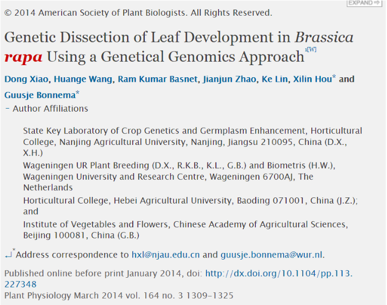 近日,我院白菜系统生物学实验室与荷兰瓦赫宁根大学(Wageningen University)植物育种系合作完成的研究论文"Genetic dissection of leaf development in Brassica rapa using a genetical genomics approach"在《Plant Physiology》上发表,影响因子为6.555。肖栋博士为第一作者,侯喜林教授与Guusje Bonnema教授为共同通讯作者,天天a片