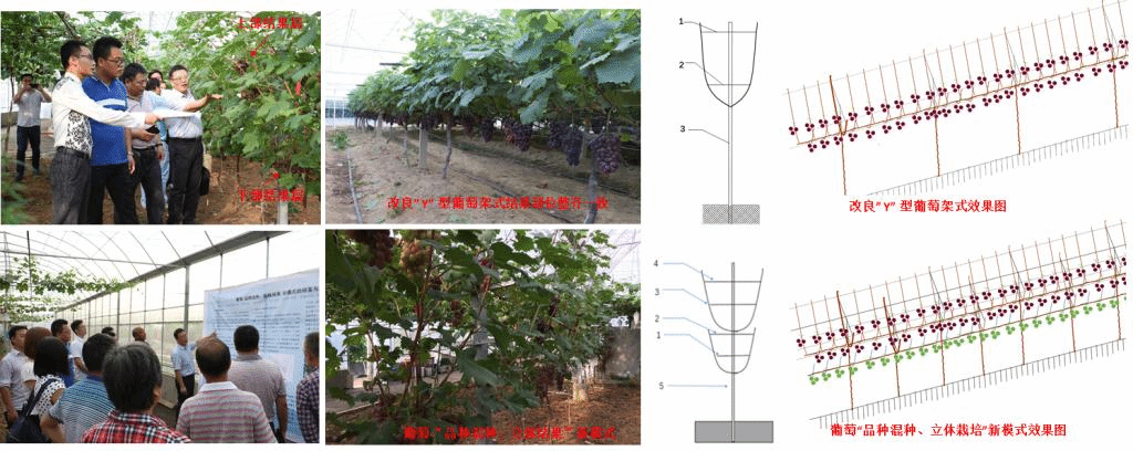 在观摩现场,房经贵教授向各位专家、果农介绍了改良“Y”型和“品种混种,立体结果”葡萄栽培新模式的技术要点和栽培成效。改良“Y”型葡萄架式通过固定调节新梢基部的开张以及顶部的收拢,使葡萄篱架两侧的果穗保持在一条水平线上,在保证产量、品质的基础上,增强了“Y”型架式的观赏性,该创新技术已经获得专利授权。“品种混种,立体结果”新模式是在改良“Y”型葡萄架式的基础上研发而来的。该栽培新模式很好地结合了葡萄优良品种丰富多样的特点,通过对2个品种间隔种植,分别利用上下层空间的措施,实现立体结果,在确保品质的基础上单产增加30%以上;通过不同果实色泽或者不同成熟期葡萄品种的间隔混种,达到了提升葡萄园观赏性以及延长葡萄果实采摘期的效果。