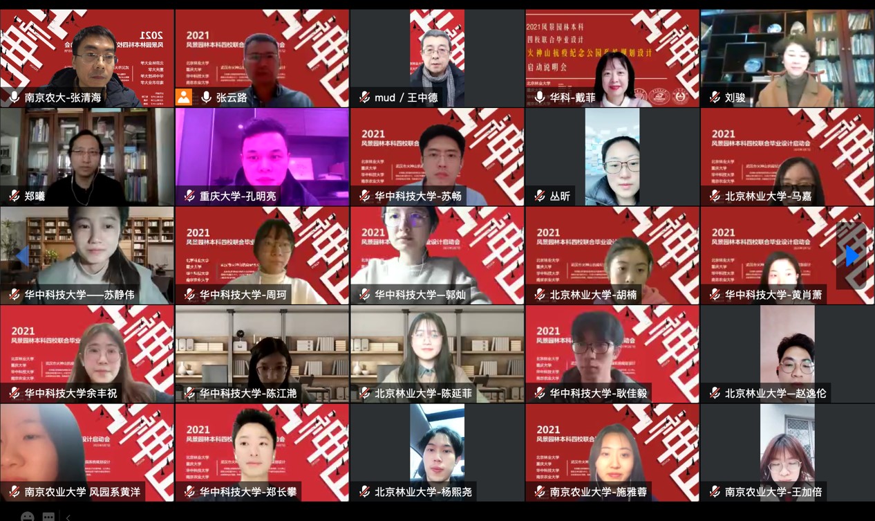 2021年3月7日下午,由北京林业大学园林学院、重庆大学建筑城规学院、华中科技大学建筑与城市规划学院和南京农业大学园艺学院4所院校联合举办的2021年风景园林本科四校联合毕业设计“武汉市火神山抗疫纪念公园系统规划设计”启动仪式,以线上会议的方式顺利拉开帷幕。
