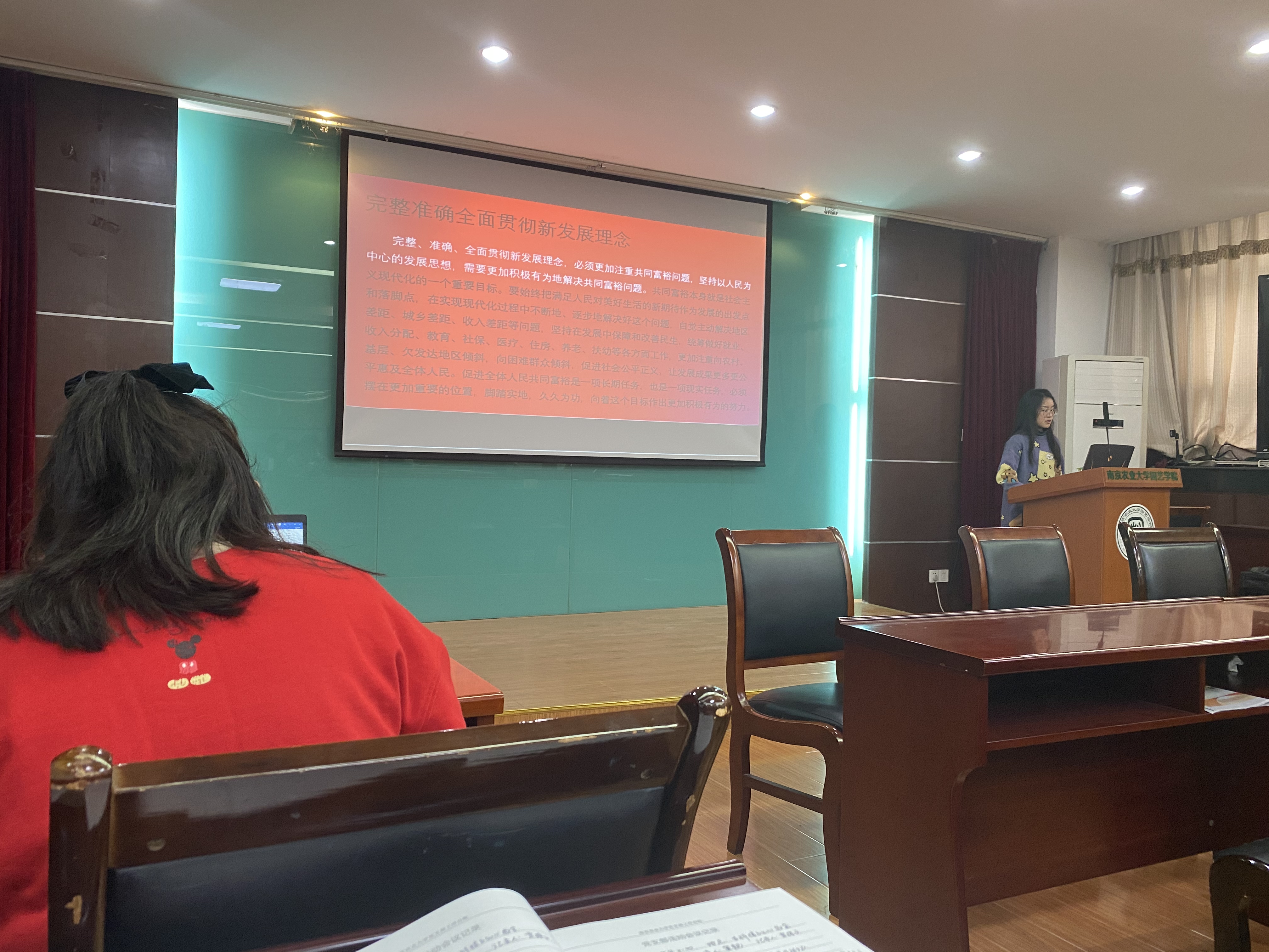 随后,入党积极分子分享自己关于“全国两会”学习的心得体会。季京京以《从全国“两会"谈乡村振兴》为主题进行了汇报,她通过一些具体事例生动形象地介绍了乡村振兴的意义,讲述了“从贫农到富农”的成果并讲解了乡村振兴的工作方向。田心宇汇报主题为《聚焦全国两会——科技创新自立目强》,她详细介绍了党中央对于“十四五"时期做出的规划,并介绍了关于科技创新的一些基础研究,提出作为研究生,应当刻苦钻研,努力提高自身的创新能力,通过科技创新来为实现中华民族伟大复兴中国梦献出自己的力量。彭鸽以“什么是两会”为引,汇报了《聚焦全国两会 十三届全国人大四次会议、全国政协十四届四次会议精神学习解读》,她带领大家学习了政府工作报告的精神要点,并温故了两会期间的热门提案。邱琳香和孙道金分别从文化强国和香港特别行政区选举制度这两个方面对《聚焦全国两会》进行了分享。周迎雪分享了有关《新发展理念》的学习心得,提到要完整准确全面贯彻新发展理念。