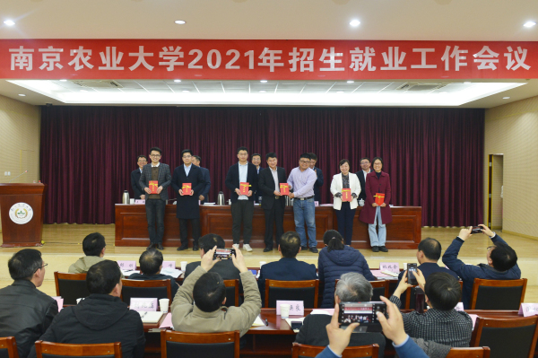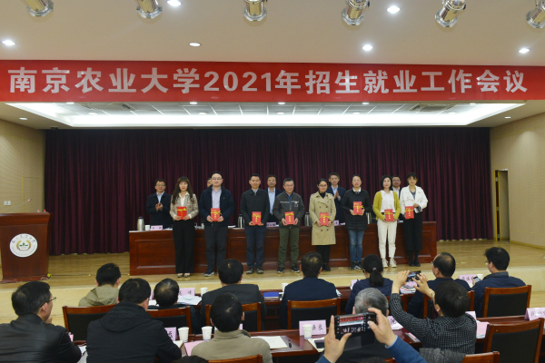 动物医学院党委书记姜岩,植物保护学院教授张春玲代表招生工作先进单位、先进个人发言,园艺院院长吴巨友,人工智能学院研究生导师任守纲代表就业工作先进单位、先进个人发言。与会校领导为获奖单位和个人颁发了奖牌和证书。