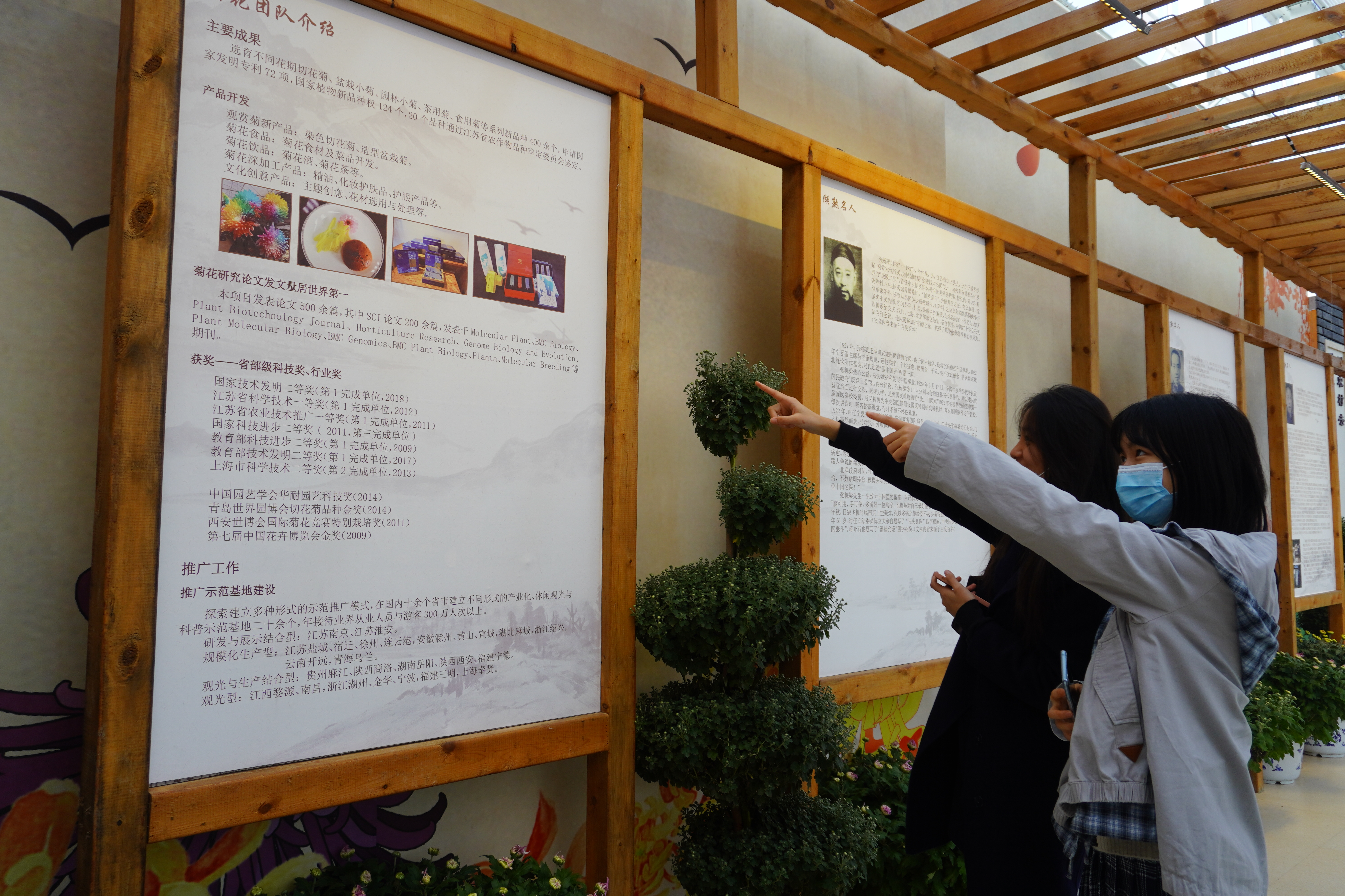 “菊”之美,不止于花,更在于人。在展厅的一角,更是展示了一代代南农人辛勤保存菊花资源、用菊花及其衍生品助力乡村振兴的点滴历程。园艺213班的吴新怡同学更是主动报名成为展厅志愿者的一员,贡献一份自己的力量,“非常开心能用自己的才艺特长为菊展增添一份趣味,在这样的志愿服务中更能了解到专业的所学所用,更加热爱园艺了!”科研人员的辛勤付出、志愿者们的热情讲解……“人情”满满,花意更浓。