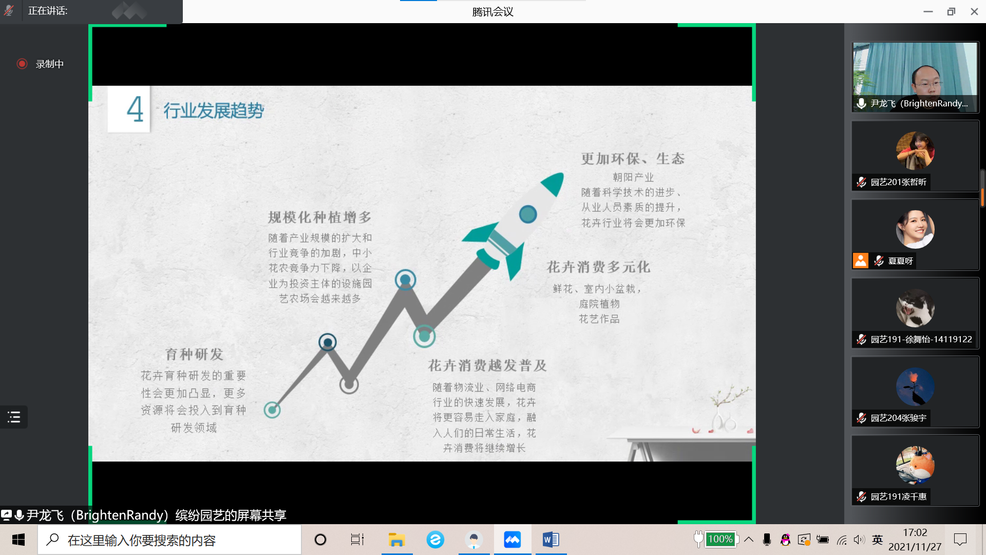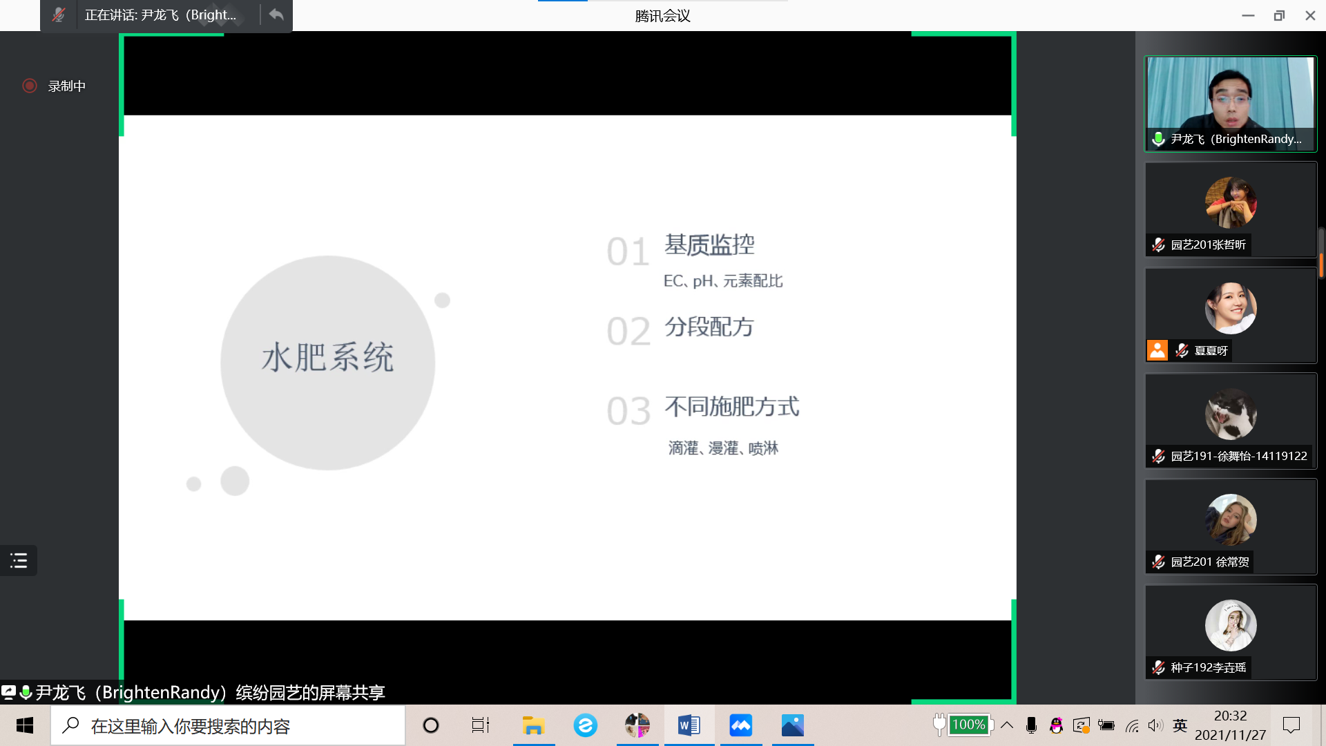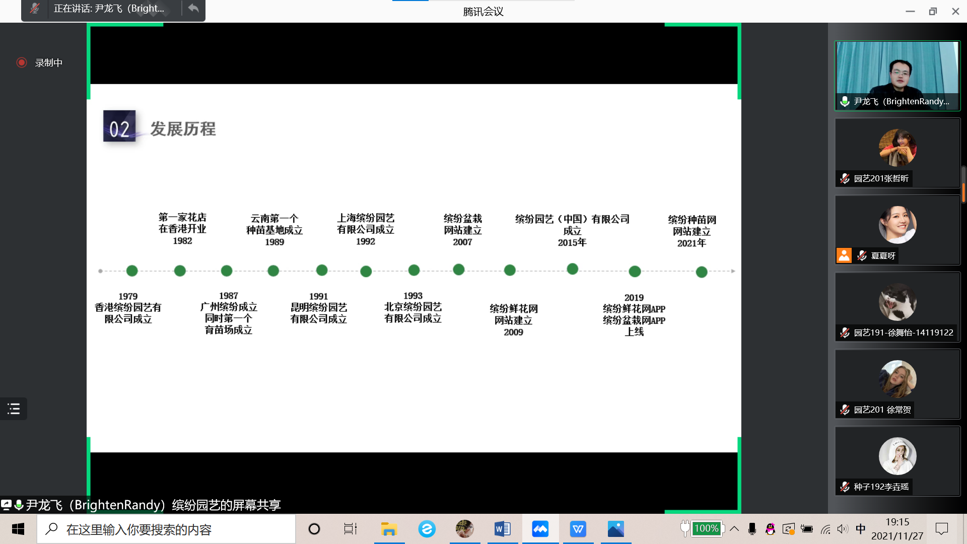 11月27日,学院邀请了缤纷园艺(中国)有限公司种苗总监黄仲恩先生、市场总监闫永兵先生、盆栽总监褚宪明先生通过线上腾讯会议的方式分别为同学们介绍了花卉行业的发展、缤纷的创建与发展以及花卉行业的前沿知识。下午黄仲恩先生首先为同学们介绍了花卉行业的历史发展,并分析了行业发展趋势,表示花卉行业从业者的使命就是立志用美丽的自然色彩装点人们的生活,实现中国跻身世界园艺强国的伟大梦想。晚上闫永兵先生从公司简介、发展历程、品牌创建以及天天a片-最新高清天天a片直通站四个方面为同学们详细地介绍了缤纷园艺(中国)有限公司;褚宪明先生从盆花的产品标准、生产管理、病虫害防治以及水肥系统为同学们讲解了花卉行业技术领域的前沿知识,帮助同学们了拓展学识,开阔了视野,激发了大家创新思维,助力大家提升学习、实践和创新的整体能力。课程结束之后,同学们踊跃提问,展现了对花卉行业甚至农业行业的热情与兴趣,同学们希望更深入了解目前全国花卉种植技术的发展等内容。