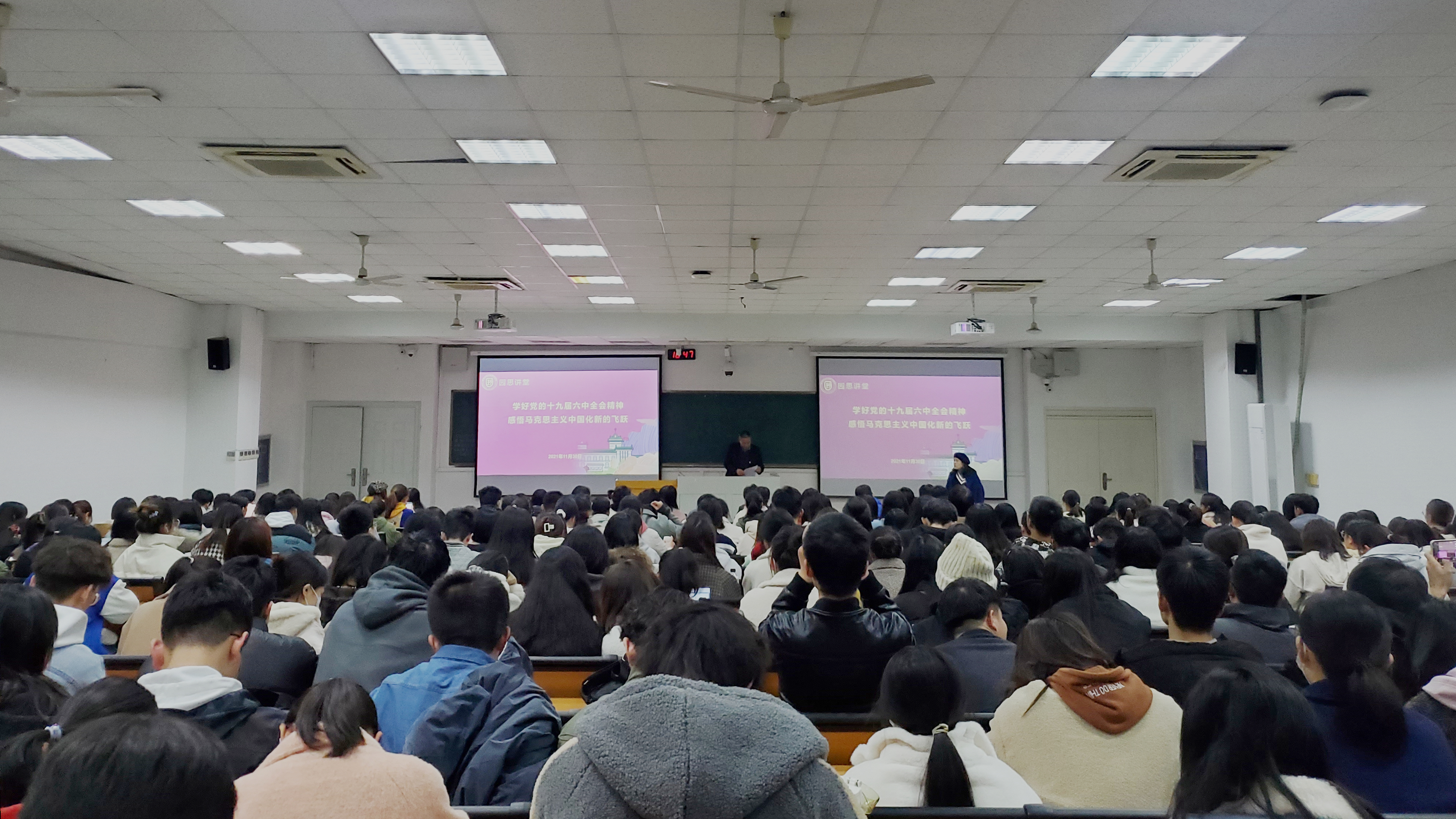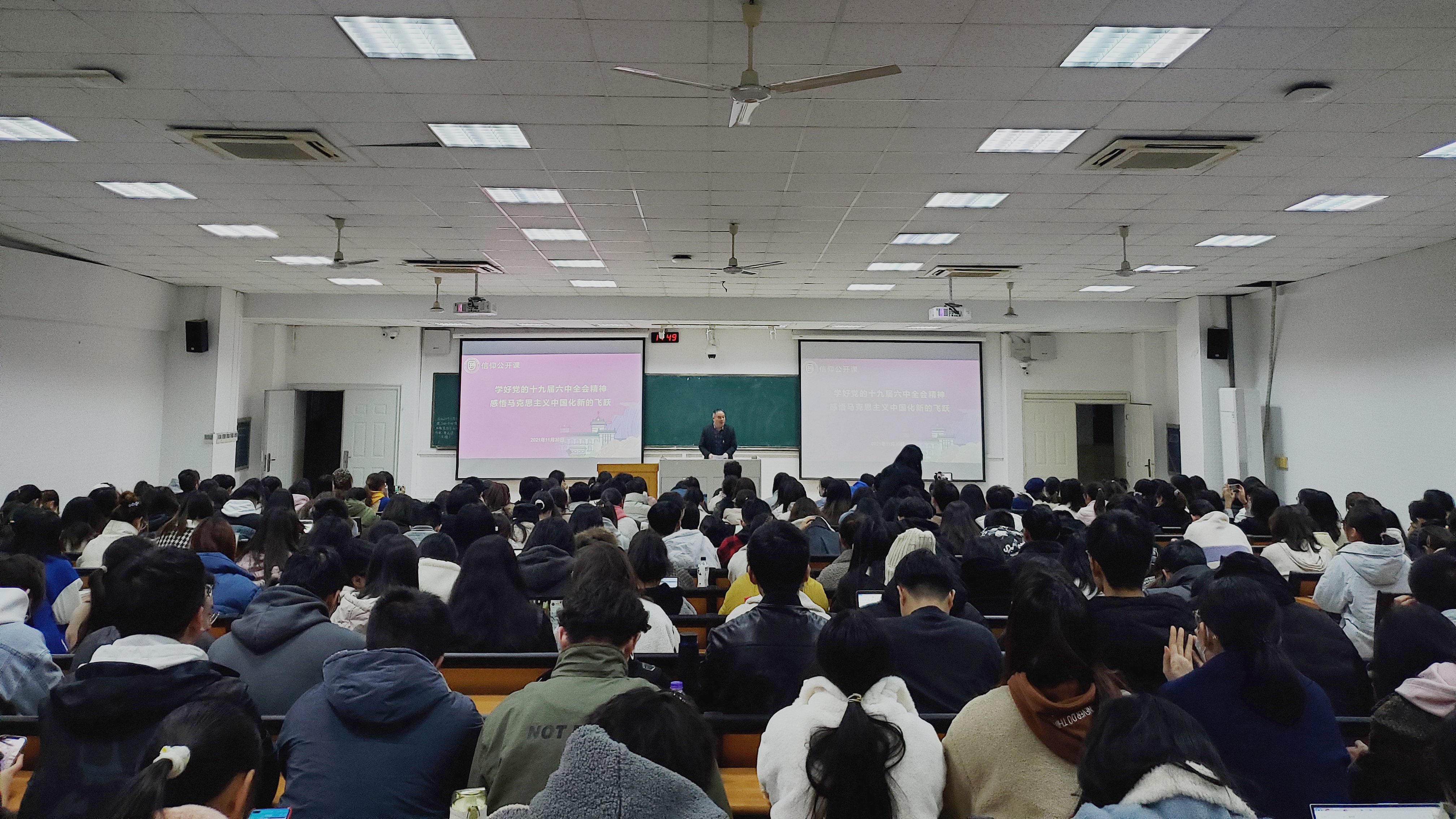在教学楼c301教室举办园思讲堂暨信仰公开课十九届精神专题学习报告会,学习会特邀马克思学院教授吴国清教授担任主讲。本科生辅导员鲁月与300余名本研学生参加了线下学习会,学院其余本研学生均通过网上直播线上观看。学习会由学院学工办主任(团委书记)窦靓主持。