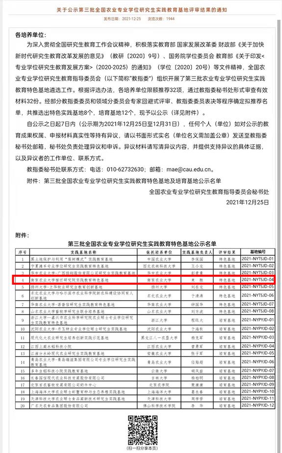 近日,全国农业专业学位研究生教育指导委员会组织开展了第三批农业专业学位研究生实践教育特色基地遴选工作。经教指委委员和领域分委员会专家评审、教指委委员表决等程序,共推选出实践教育特色基地8个,培育基地12个,南农大天天a片