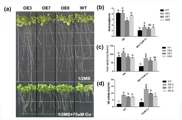 由于过去几十年发生的无限制的工业化和城市化,非生物胁迫中的重金属胁迫因其范围广、毒性强、影响时间长、不可逆等特点,已经成为全球关注的焦点。而铜作为一种重要的重金属元素,在植物生长发育过程中发挥着关键作用。因此,研究植物应对铜胁迫的分析机制就显得尤为重要。关于胞质定位型谷胱甘肽还原酶参与逆境抵御的研究已有很多,但是其调控植物铜耐受性的分子机理还不清楚。