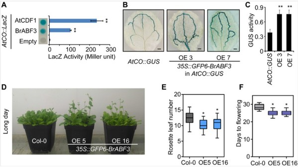 开花使植物从营养生长阶段顺利过渡到生殖生长阶段,适时成花转变是高等植物生命周期中一个至关重要的生物过程,受到内/外源因素、各种信号网络及众多基因的综合调控。各种非生物胁迫,如营养缺乏、盐和干旱等,也影响开花时间。而植物早花作为一种干旱逃逸机制,在水稻、拟南芥和不结球白菜等多种植物中保守存在。该研究通过各种遗传和生化实验,首次证实不结球白菜BrABF3是除CDFs、FBHs和TCPs转录因子以外能直接与CO启动子结合并激活其表达的转录激活因子,并由此介导ABA诱导的成花转变过程。这一机制可能是确保白菜适时过渡到开花阶段所必需的,尤其是在干旱胁迫条件下。