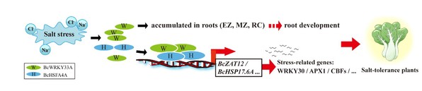 盐渍化是威胁作物发育和生产的一种常见的环境胁迫,在全球变暖和严峻的环境挑战下,土壤盐渍化加剧导致全球耕地面积逐渐减少。植物在生长发育的过程中,盐胁迫往往影响种子的萌发速度,限制根系的吸收能力和正常生长,最终导致植物萎蔫甚至死亡。因此,了解植物耐盐性的分子机制具有重要意义。众所周知,WRKY33作为植物防御过程中重要转录因子被广泛研究,然而,其参与植物响应盐胁迫过程的潜在分子机制尚未完全明确。该研究表明,不结球白菜BcWRKY33A定位于细胞核,具有较强的转录激活能力。在盐胁迫下,BcWRKY33A的表达被强烈诱导,并在植物的根系中大量积累,促进高盐环境下的根系发育。同时,BcWRKY33A与BcHSFA4A相互作用,协同调控下游耐盐基因(如BcZAT12和BcHSP17.6A)的转录与表达,从而赋予不结球白菜较强的耐盐能力。