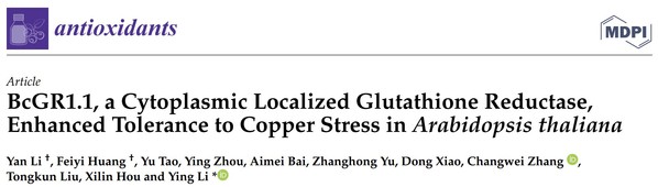 李英教授为通讯作者的论文“BcGR1.1, a Cytoplasmic Localized Glutathione Reductase, Enhanced Tolerance to Copper Stress inArabidopsis thaliana”,该论文揭示了不结球白菜BcGR1.1增强植物铜耐受性的分子机理。本研究表明,在不结球白菜中,BcGRs的4个同源基因分为两种亚细胞定位类型:细胞质定位型和叶绿体定位型。其中BcGR1.1对铜胁迫最为响应。与野生型拟南芥相比,BcGR1.1过表达植株表现出较好的生长状态。这是由于BcGR1.1的表达可以调节AsA-GSH循环,提高GSH积累、ASA利用和部分抗氧化酶活性,以清除铜胁迫引起的ROS,从而提高植物对铜胁迫的耐受性。