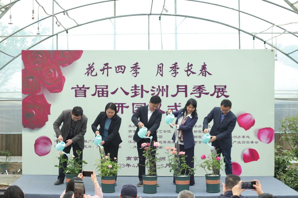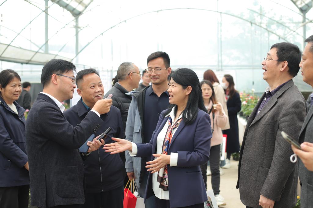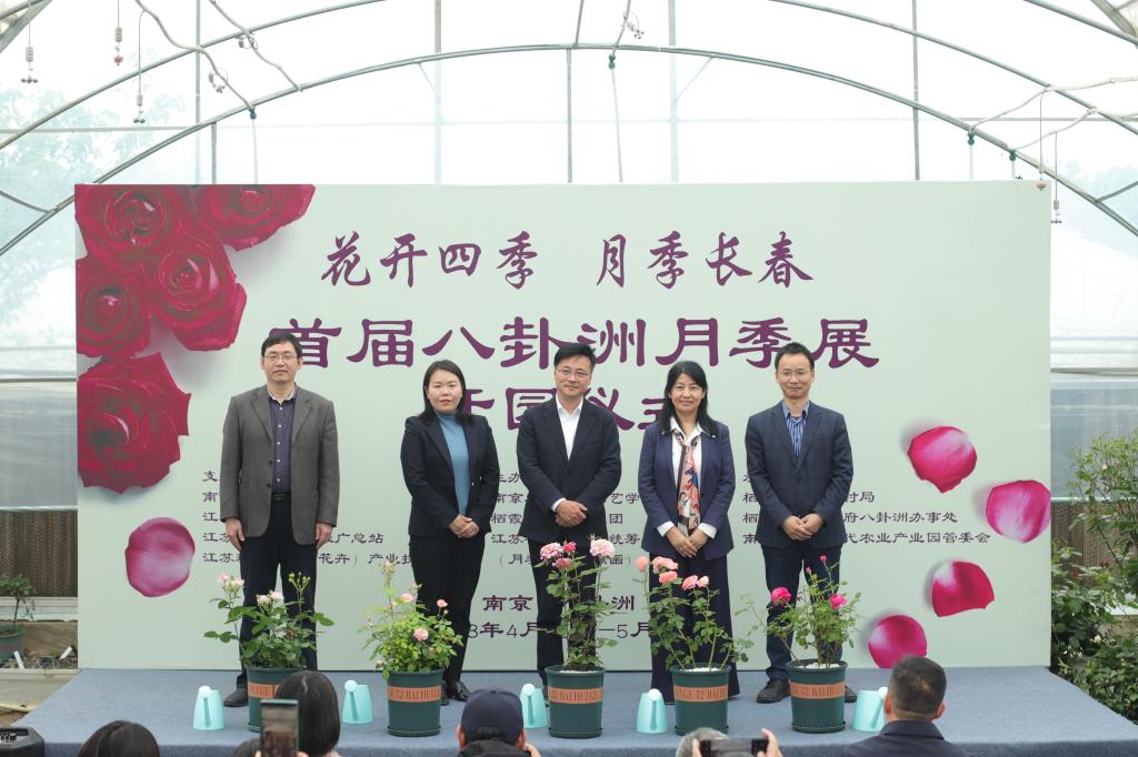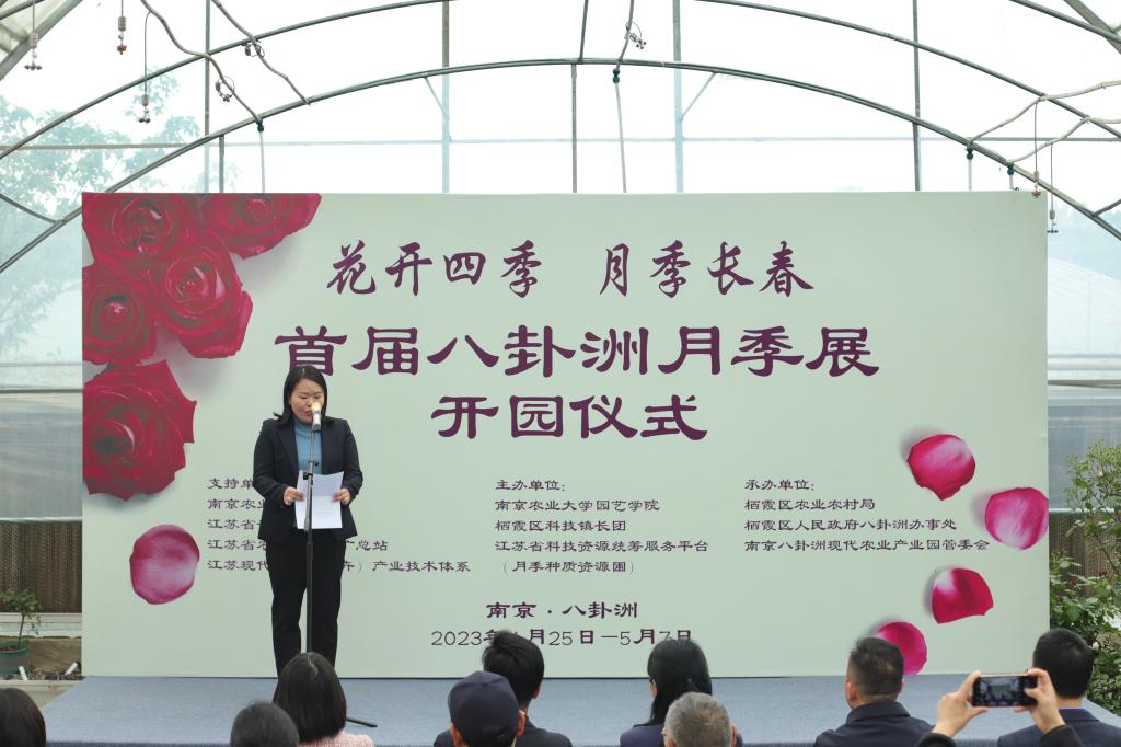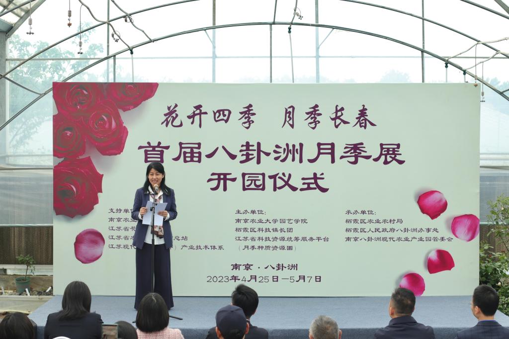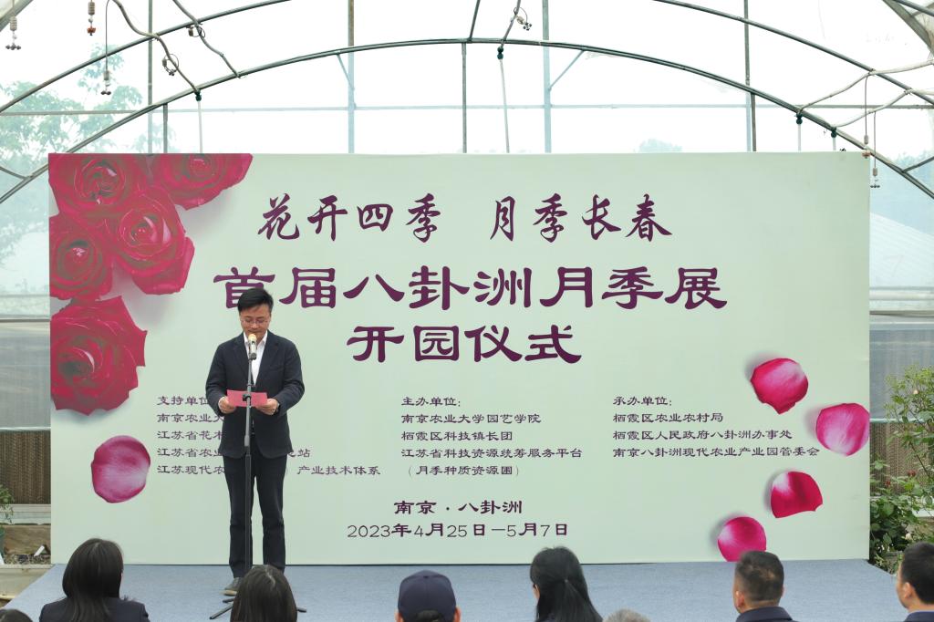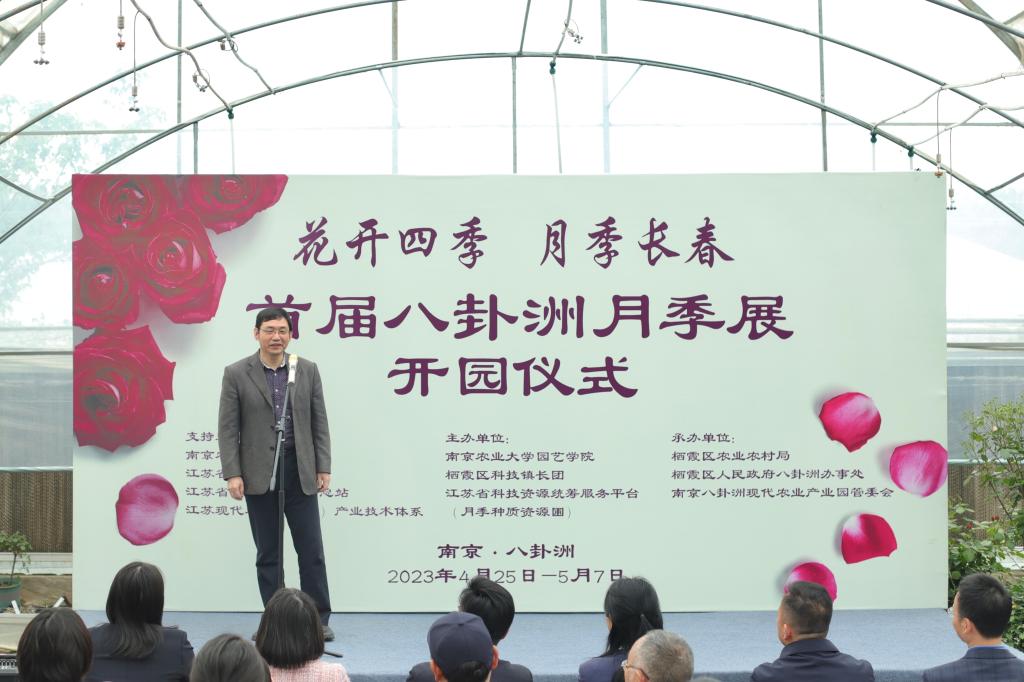 的基本概况后,陈院长表示此次展览不仅仅是我院月季团队和基地的成果展,也是栖霞区科技镇长团和栖霞区八卦洲街道乡村振兴工作的阶段性呈现。并希望月季团队能以此次展览为契机,“以花为媒”,汇聚各方智力、凝聚多方力量,推动科技创新,不断产出顶天立地的成果,服务农业强国与乡村振兴;继而以此次展览为新起点,躬耕不辍,着力推进农业与旅游、教育、文化与产业的深度融合,打造宜居宜业美丽乡村,打造八卦洲乡村旅游新地标。并预祝本次展览取得圆满成功。
