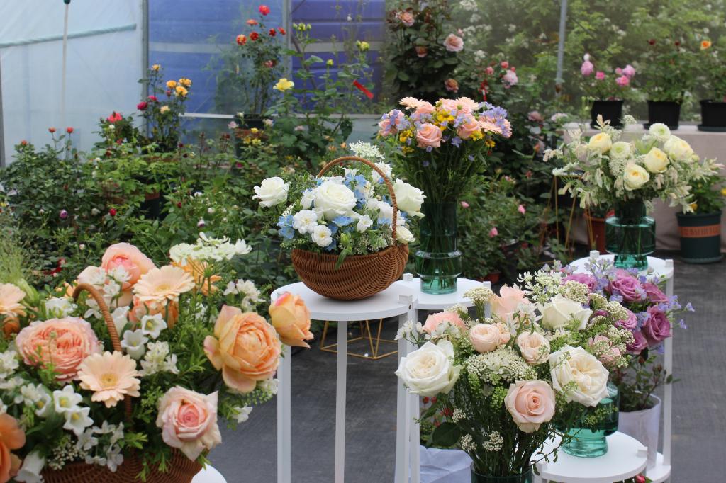 首届八卦洲月季展现场的月季花艺作品展示