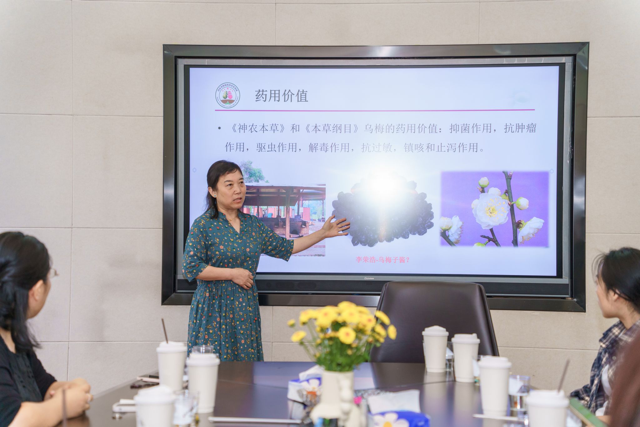 经过两位老师引人入胜的介绍和讲解,在场师生都对我国果梅、菊花等产业现状和未来发展模式有了全面而深刻的了解。讲解过后,大家针对种质资源保护与利用等问题分别向两位主讲人提出问题,并共同品鉴由菊花、果梅加工而成的菊花酒、果酒,果梅加工的果干、果脯等,现场气氛热烈而融洽。