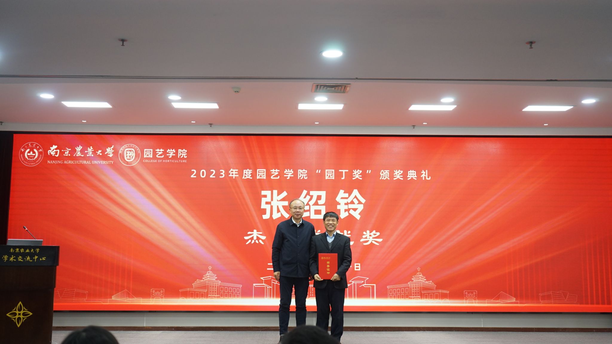 2023年度“园丁奖”系列奖项颁奖典礼,分别授予张绍铃教授“杰出成就奖”、吴巨友、柳李旺、王鹏“勇新奖”、刘丹、侍婷、王乙明“勤园奖”,管志勇、滕年军、王海滨“精艺奖”。