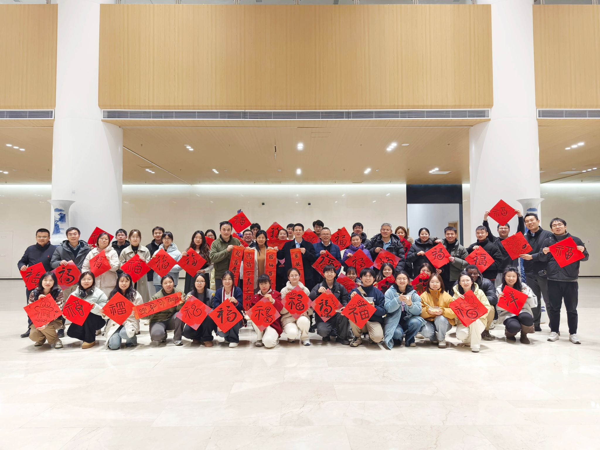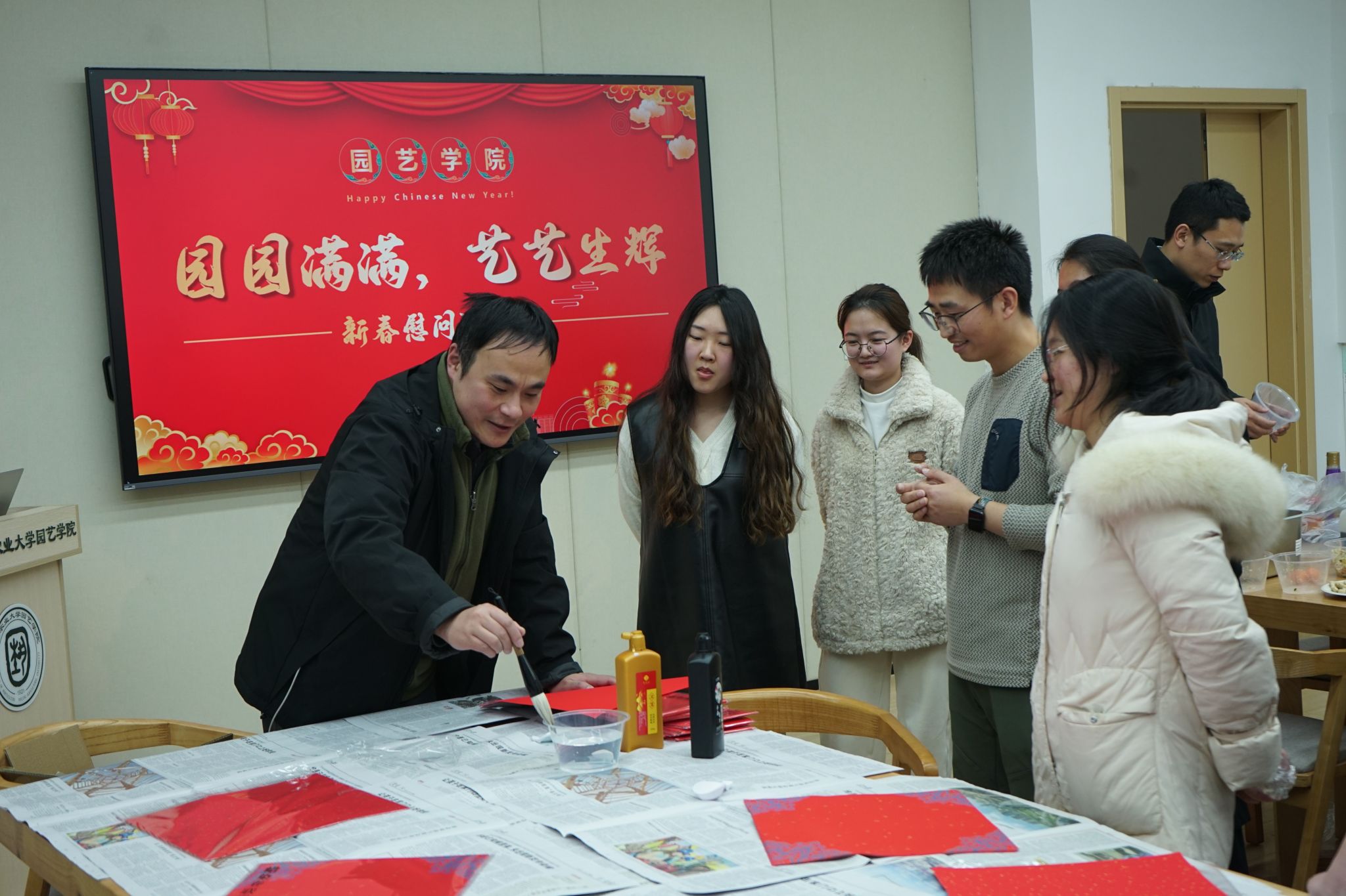 座谈会结束后,师生们共同参与了包饺子、写春联福字等活动。大家分工合作,在欢声笑语中,传递了节日的喜悦,更凝聚了师生间的深厚情谊。最后师生们围坐在一起,品尝着亲手包的饺子,互赠着亲手写的春联福字,分享着2024年的生活点滴和2025年的希望憧憬,感受着“园艺家文化”的温暖与节日的欢乐。