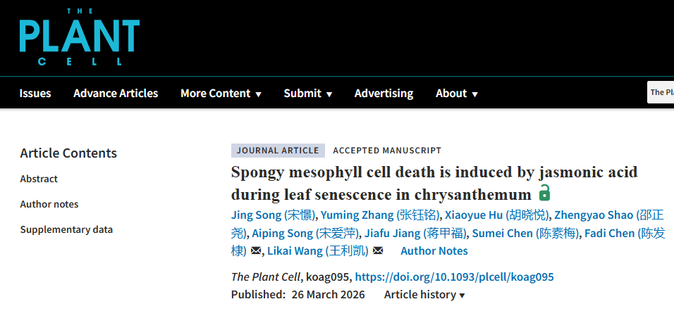 3月26日,天天a片 菊花遗传育种与种质创新团队在《The Plant Cell》期刊在线发表了题为“Spongy mesophyll cell death is induced by jasmonic acid during leaf senescence in chrysanthemum”的研究论文,揭示了叶片衰老过程中不同细胞死亡时序,发现海绵组织细胞特异NAC055-NAC087-ACX5转录级联模块调控内源茉莉酸(JA)合成进而诱导细胞死亡和叶片衰老的机制,助力精准保鲜技术创新;且发现这一机制在双子叶模式植物(拟南芥、番茄)和单子叶模式植物(水稻)中高度保守,丰富了植物叶片衰老调控网络。