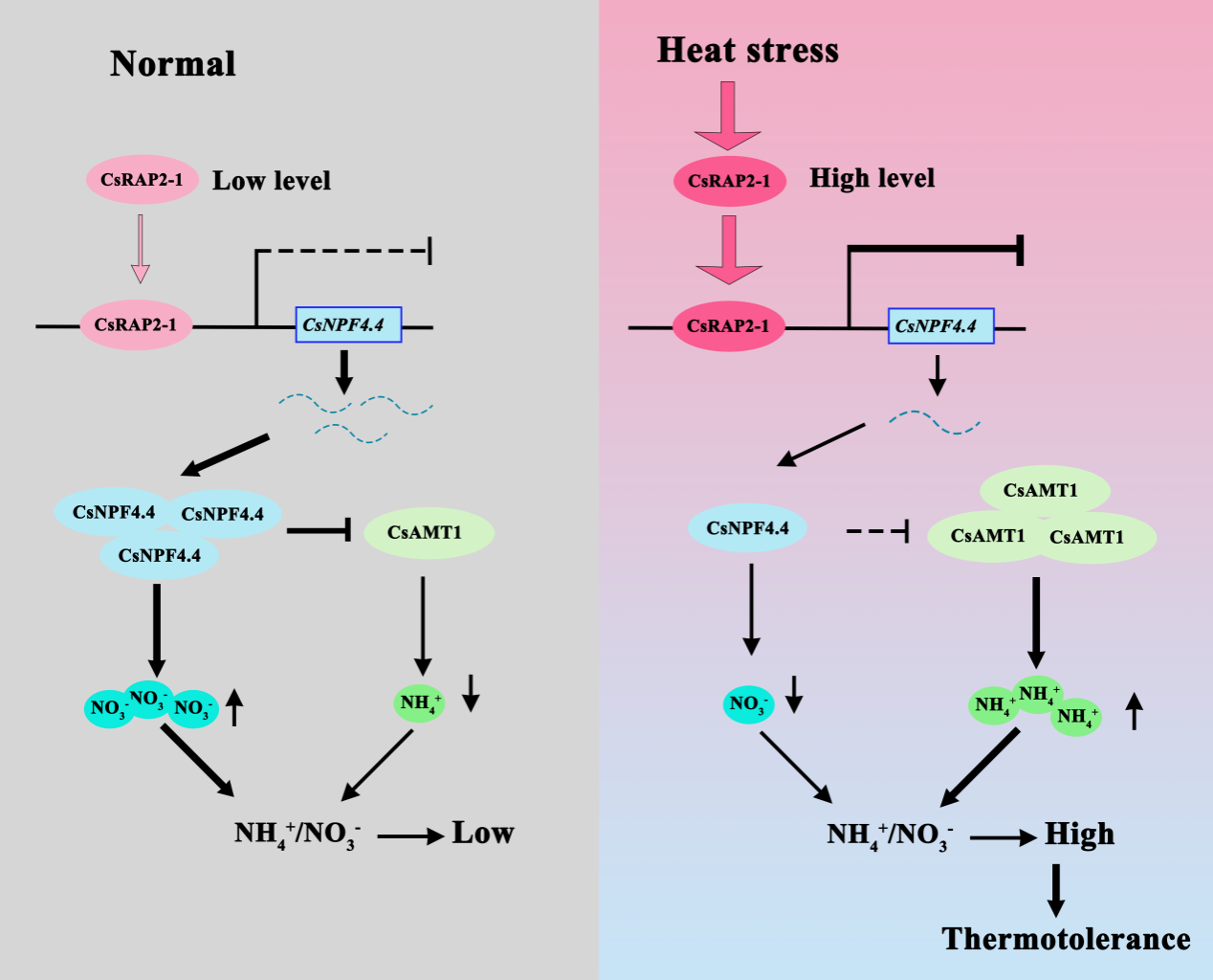 综上,该研究揭示了CsRAP2-1-CsNPF4.4-CsAMT1调控模块通过精细调节NH₄⁺/NO₃⁻稳态来增强耐热性的机制,为通过分子育种或养分管理策略提高作物在高温胁迫下的抗逆性提供了可操作靶点。