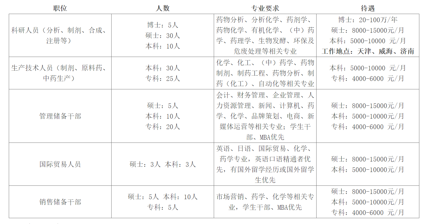 招聘制剂生产工艺和质量管理人才,同时面向全国招募医院和商业公司渠道代理商。