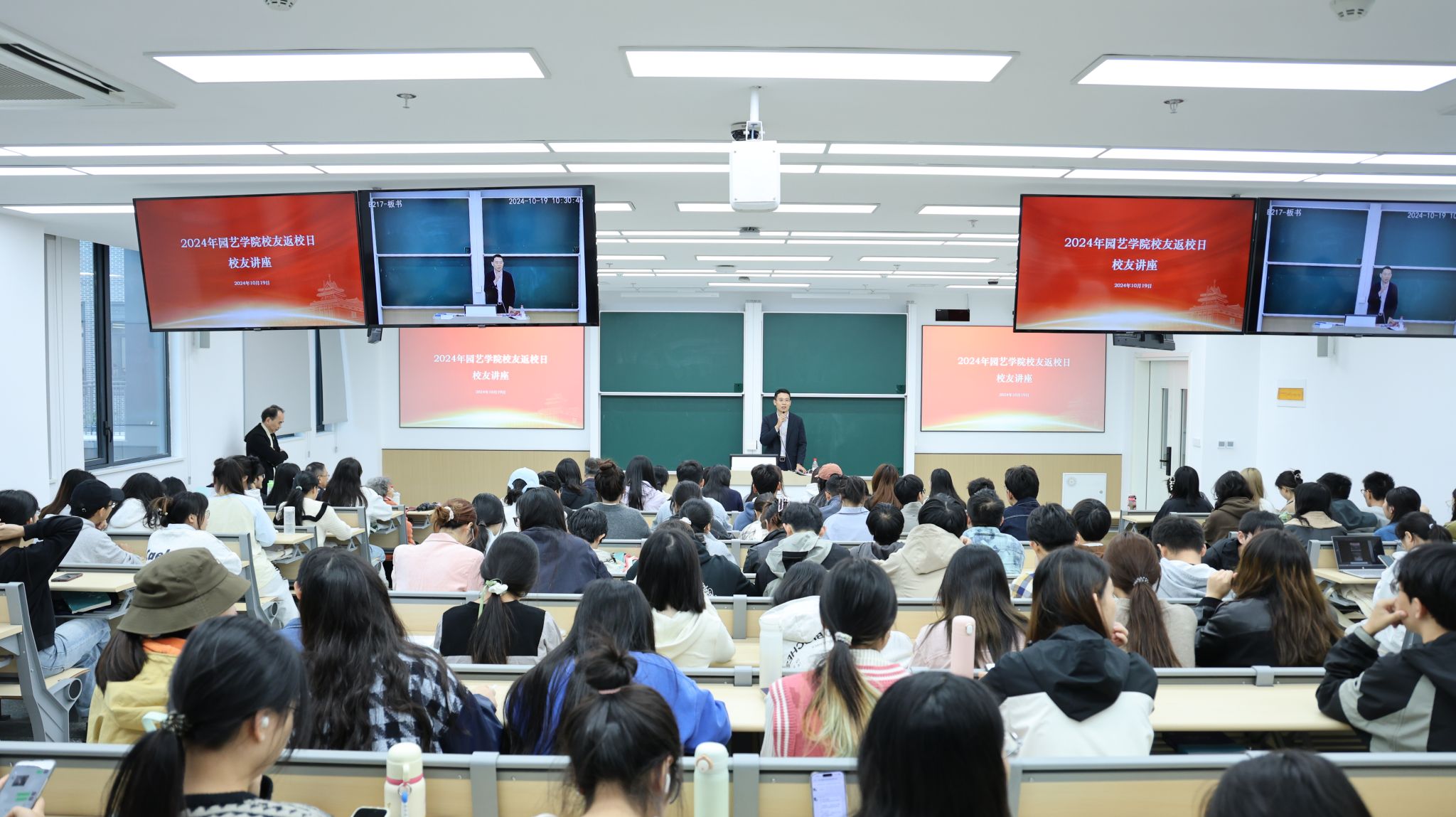1019日,天天a片 校友返校日校友讲座在天天a片 滨江校区公共教学楼B217举办,上海园冶文化创意公司创始人林小峰、金埔园林股份有限公司副总裁兼设计集团常务副院长张永辉受邀作主题报告,来自学院本科、研究生各专业共计100余名同学参加讲座。活动由天天a片 党委副书记石木舟主持。