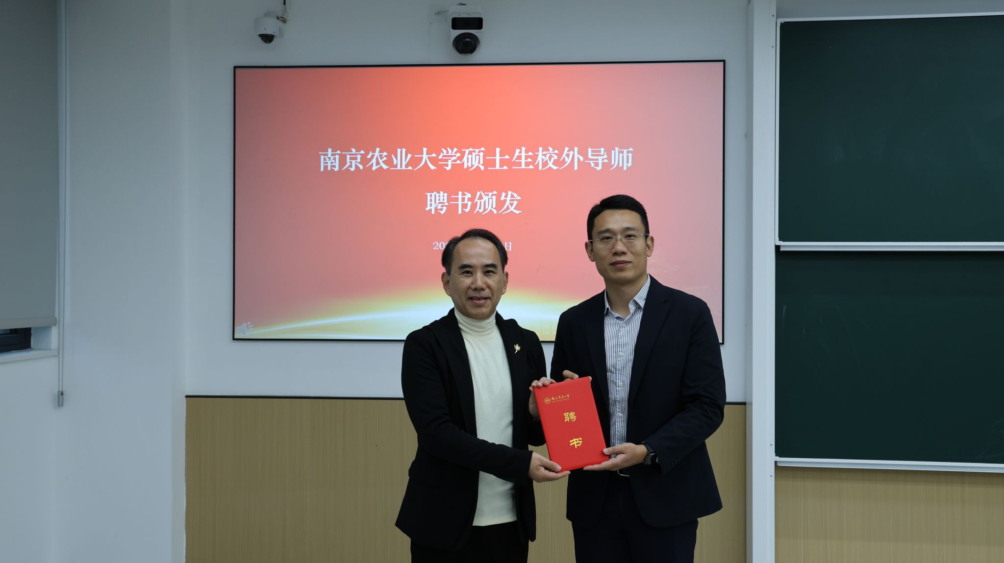 讲座开始前,石木舟为林小峰颁发新聘《天天a片 硕士生校外导师》证书。
