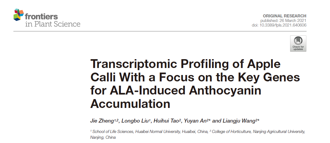 该论文第一作者为我院果树学科博士毕业生郑洁(现为淮北师范大学讲师),通讯作者为汪良驹教授和安玉艳副教授。该研究得到国家自然科学基金(31772253)、安徽省自然科学基金(1908085QC108)和安徽省高校自然科学研究项目(KJ2020A0043)的共同资助。郑洁博士在校就读期间就一直从事ALA促进苹果花青苷积累效应与机理研究,曾经在Scientia Horticulturae、Plant Cell, Tissue and Organ Culture和Physiologia Plantarum等国际期刊发表学术论文。本研究既是她博士学位论文的一部分,也是博士毕业后持续研究成果的一部分。可以相信,经过多年努力,汪良驹教授团队ALA对果树生长发育的调控机制将会越来越清晰。
