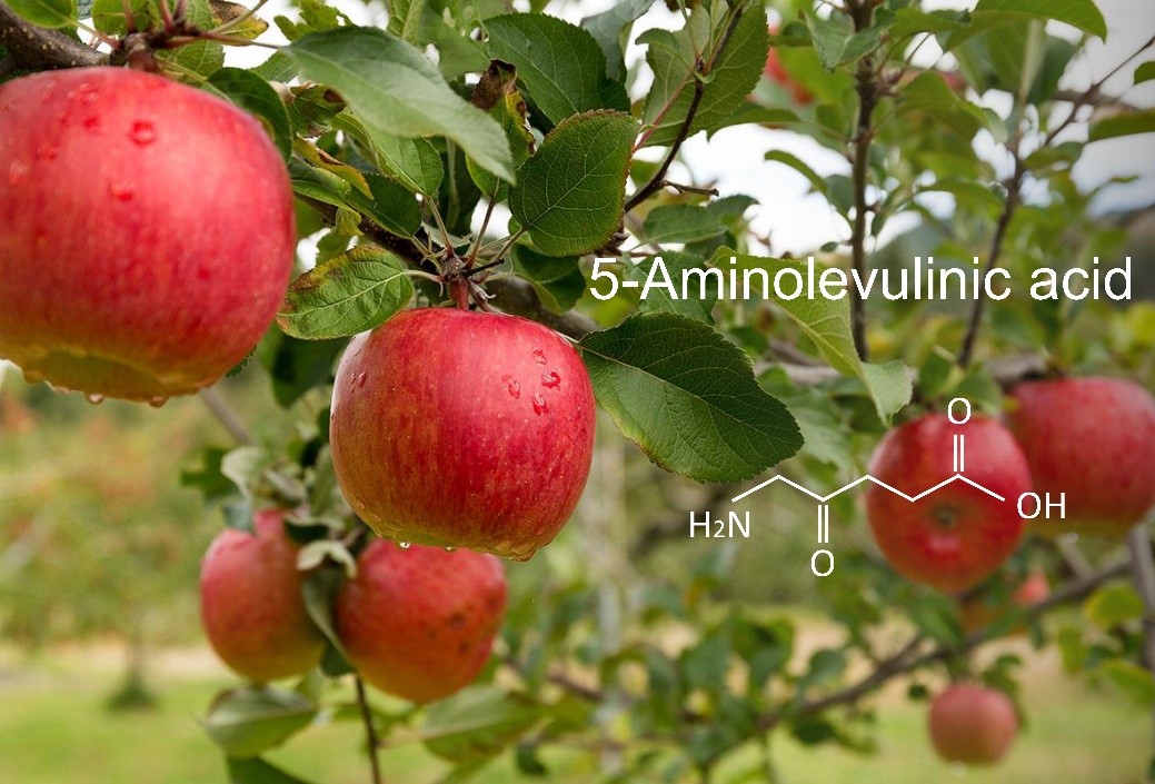 花青苷是黄酮类次生代谢产物,广泛分布于植物的花、果实和种子。对于红色系果实而言,花青苷决定果实色泽,是评价果实外观品质和商品价值的重要指标。5-氨基乙酰丙酸(5-Aminolevulinic acid, ALA)是生物体内所有四吡咯(卟啉)化合物生物合成的关键前体。汪良驹等(2004)率先提出,ALA能够显著促进光照不足条件下苹果果实着色。这一效应相继在梨、桃、葡萄、荔枝、草莓等果实上证实,说明它在改善果实色泽、提高果实品质上有着广阔应用前景。然而,ALA促进果实着色的机理有待深入研究。