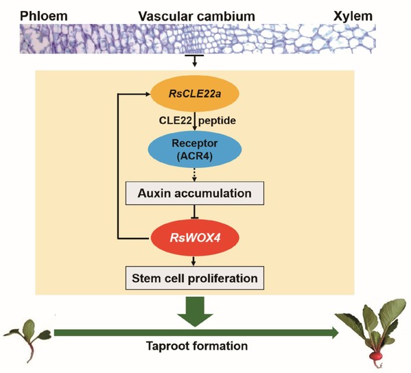 萝卜遗传育种团队题为“RsCLE22a Regulates the Taproot Growth through Auxin Signaling-related Pathway in Radish (Raphanus sativusL.)” 的研究论文,初步揭示了形成层特异性CLE22短肽通过调节维管形成层区域生长素的积累,并与RsWOX4基因形成负反馈调节环,精确调控萝卜肉质根维管形成层活性,进而参与肉质根形态建成过程的分子机制。