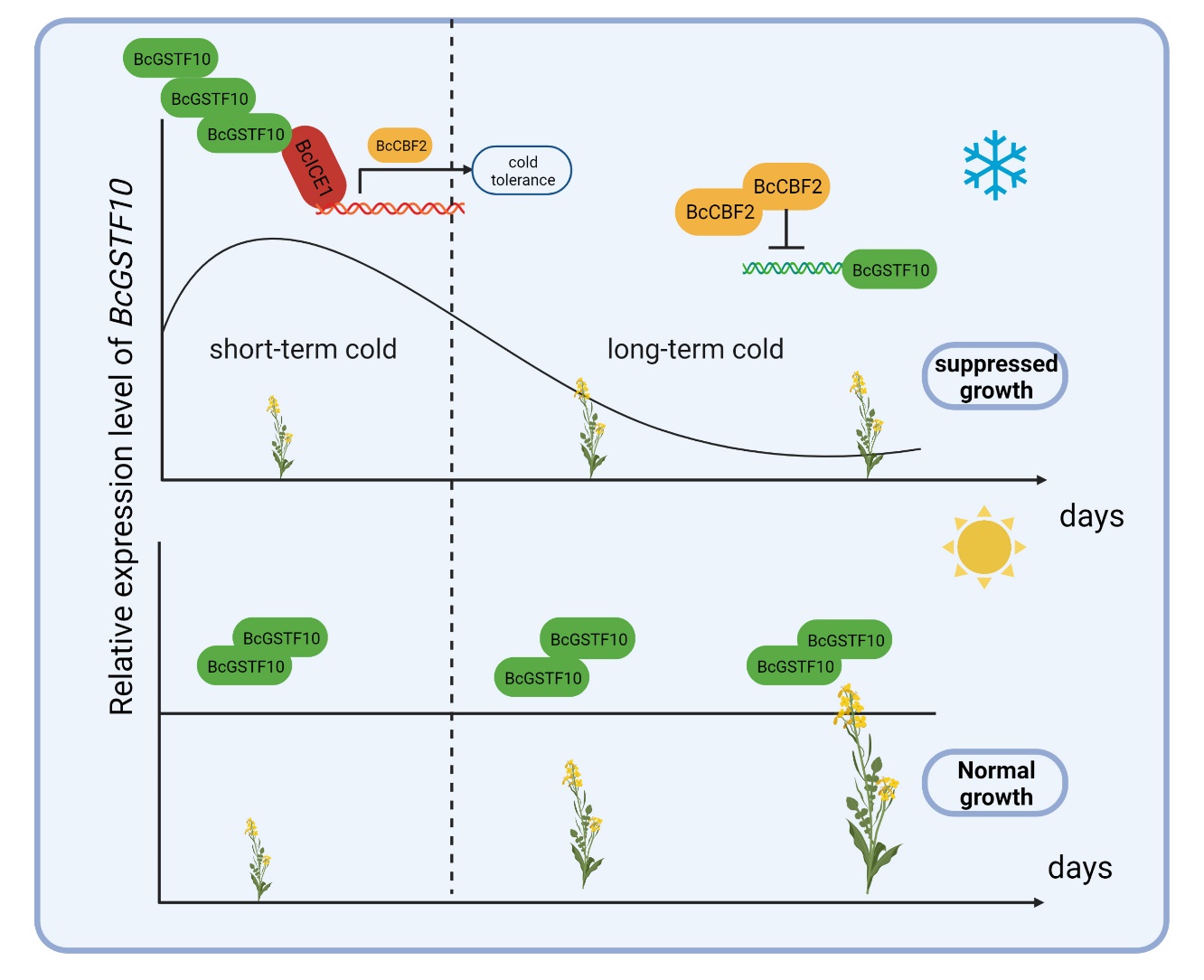 本研究发现了BcGSTF10在促进不结球白菜生长发育和抵御低温胁迫中的双重功能,揭示了BcGSTF10在协调植物生长发育和低温响应中的分子机理。