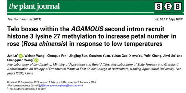 王长泉教授团队在The Plant Journal杂志发表了题为“Telo boxes within the AGAMOUS second intron recruit histone 3 lysine 27 methylation to increase petal number in rose (Rosa chinensis) in response to low temperatures”的研究成果,该研究从月季Rosa chinensis‘Old Blush’的AGAMOUS基因中鉴定到Telo boxes在低温下招募H3K27me3修饰,随后抑制AGAMOUS表达使得月季在低温下花瓣数目增加。