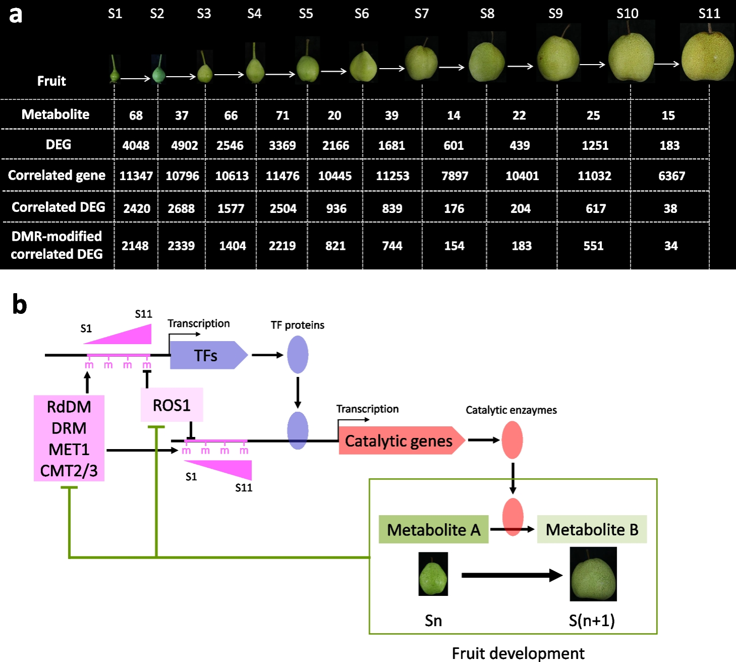 图3.梨果肉发育过程中代谢物、基因和DNA甲基化的调控模式图