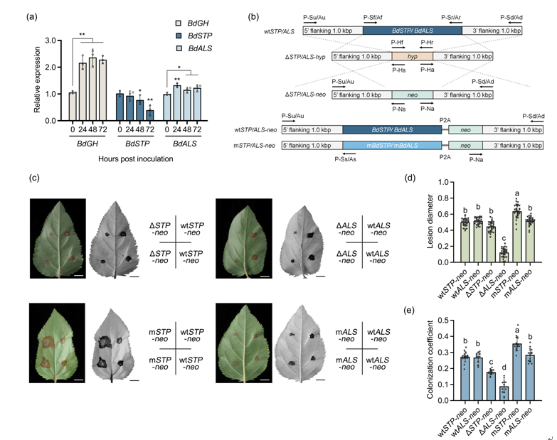 进一步研究发现,葡萄座腔菌接种后,湖北海棠miR159a能够通过外泌体传递到入侵真菌中。利用烟草共表达和真菌原生质体转化试验,分别从体外和体内证实miR159a靶向葡萄座腔菌糖转运基因STP。敲除BdSTP导致病原菌生长缺陷,而敲入miRNA不敏感型的突变BdSTP增强真菌致病性;另一方面,抑制miR159a显著增加湖北海棠对葡萄座腔菌侵染的敏感性。因此,miR159a介导苹果种质的跨界RNAi轮纹病防御途径,湖北海棠的轮纹病抗性依赖miR159a对BdSTP的跨界RNAi。此外,该研究从苹果miRNA的葡萄座腔菌目标基因中发掘出乙酰乳酸合酶基因ALS。BdALS不是湖北海棠跨界RNAi防御途径的天然真菌靶标,但参与病原菌生长和致病过程,是更具应用潜力的抗葡萄座腔菌位点。