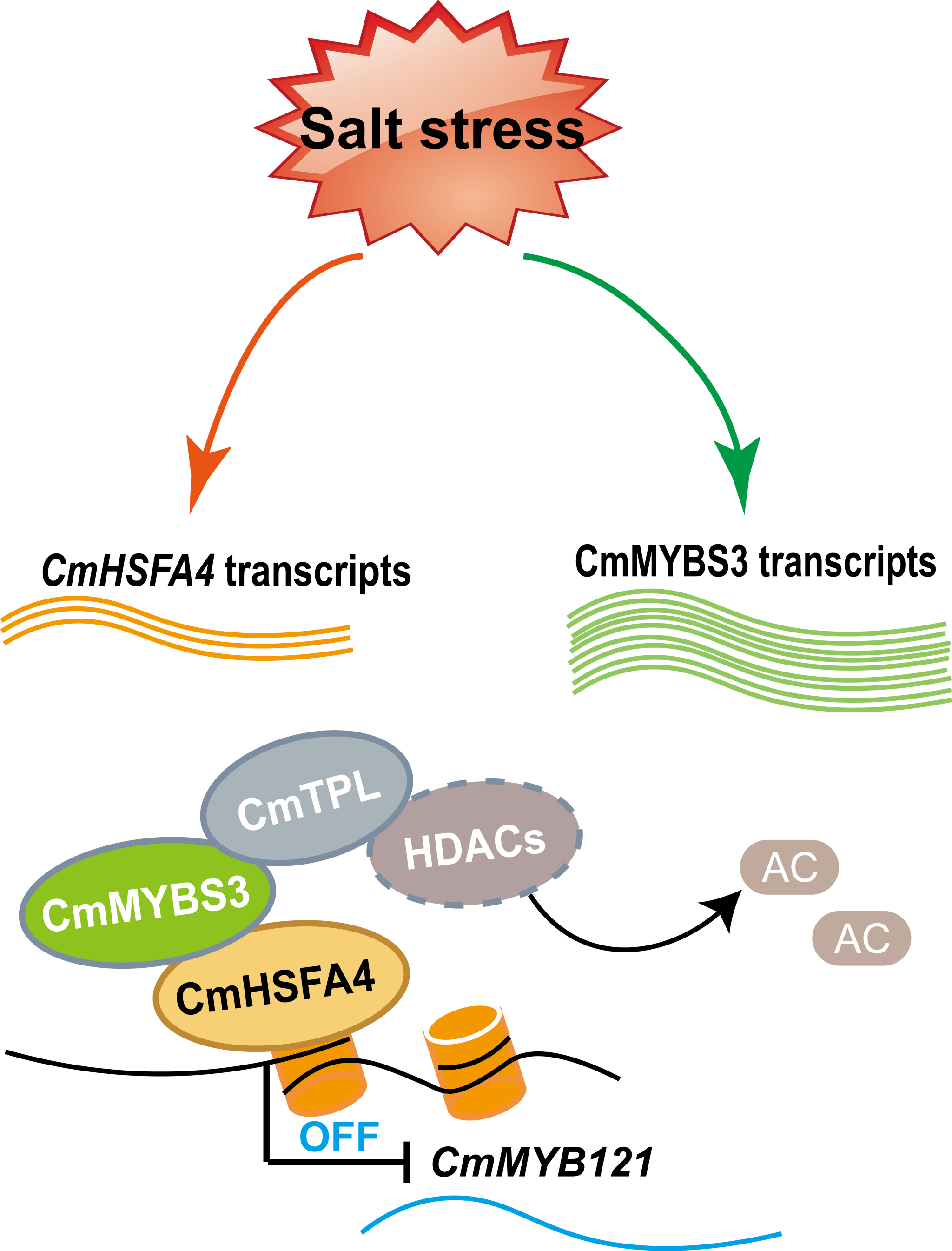本研究通过分析盐胁迫下CmHSFA4过表达转基因菊花的转录组数据,挖掘到下游候选靶基因CmMYB121,CmMYB121是菊花响应盐胁迫的负调控因子,进而通过酵母单杂交、EMSA、ChIP-qPCR及基因瞬时沉默等技术验证CmHSFA4对CmMYB121基因的结合调控。进一步借助酵母双杂交、体外Pull-down和双分子荧光互补技术发掘并证实了CmHSFA4与转录抑制因子CmMYBS3互作,进而发现两者互作后抑制下游CmMYB121表达,且该抑制作用依赖于CmMYBS3。更深入的研究揭示,CmMYBS3通过其C端EAR基序招募CmTPL形成CmHSFA4-CmMYBS3-CmTPL蛋白复合体,影响CmMYB121启动子区H3、H4乙酰化水平抑制其表达,进而正调控菊花耐盐性。这些发现为盐胁迫下基因调控网络的解析提供了新见解,为菊花抗性新种质创制提供了基因储备。