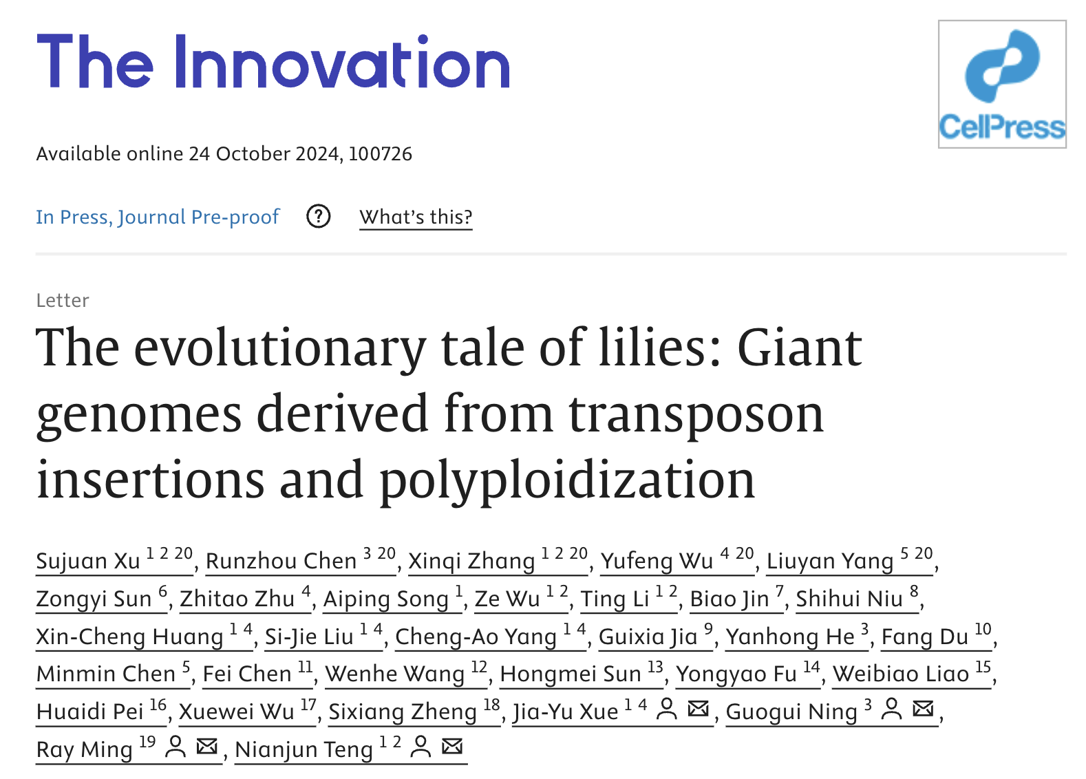 滕年军教授团队、薛佳宇副教授团队,华中农业大学园艺林学学院宁国贵教授团队与福建农林大学明瑞光教授团队等国内10多家科研团队联合公布了百合高质量染色体级别基因组,成为世界上首个正式报道的最大植物基因组。天天a片-最新高清天天a片直通站相关的文章“The evolutionary tale of lilies: Giant genomes derived from transposon insertions and polyploidization”发表在《The Innovation》期刊。