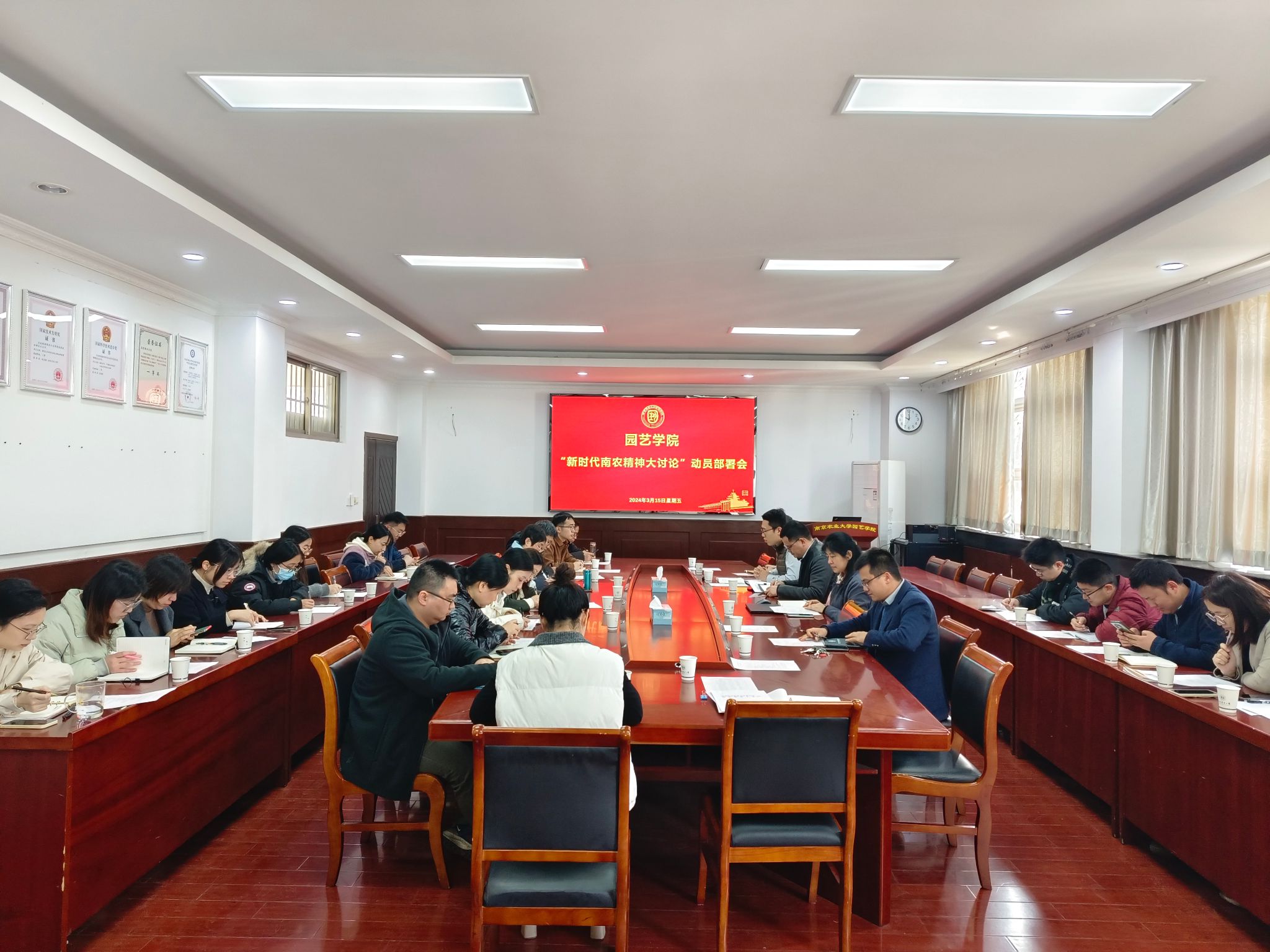 3月15日上午,天天a片 在生科楼B4003召开新学期党委扩大会暨“新时代南农精神大讨论”工作动员部署会,全体院领导、党委委员、党支部书记参加了会议。会议由石木舟副书记主持。