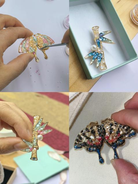 通过制作螺钿胸针这一承载着商周文明印记的传统工艺,女老师们在指尖与贝母的对话中,感受中华工匠精神的生生不息。创作过程中,科研能手们化身艺术匠人,实验记录的严谨化作造型构图的精妙,分子操作的精准转为贝片裁切的细致。本次沙龙创新性地将非遗传承与师德建设相结合,既延续了支部"以美育人"的传统,更彰显了新时代女性知识分子的多元风采。